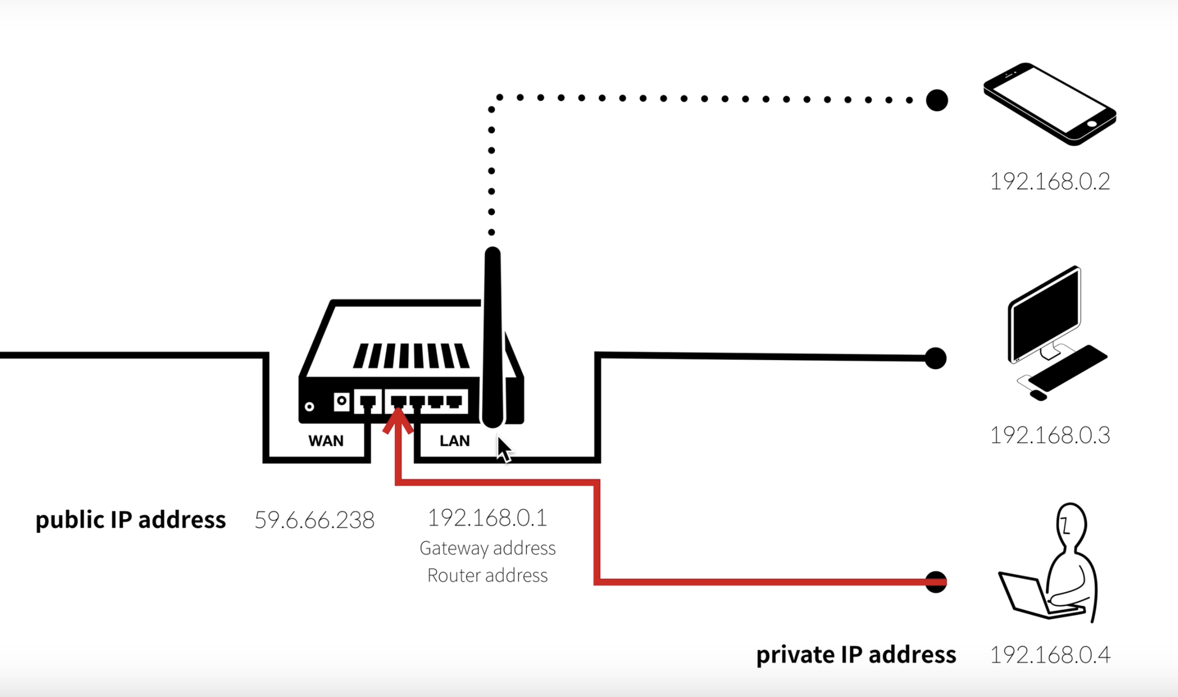 # 3. 공유기의 NAT 기술을 사용하여 사설 IP를 공인 IP로 변경합니다. 192.168.0.1(사설) -> 59.6.66.238(공인)