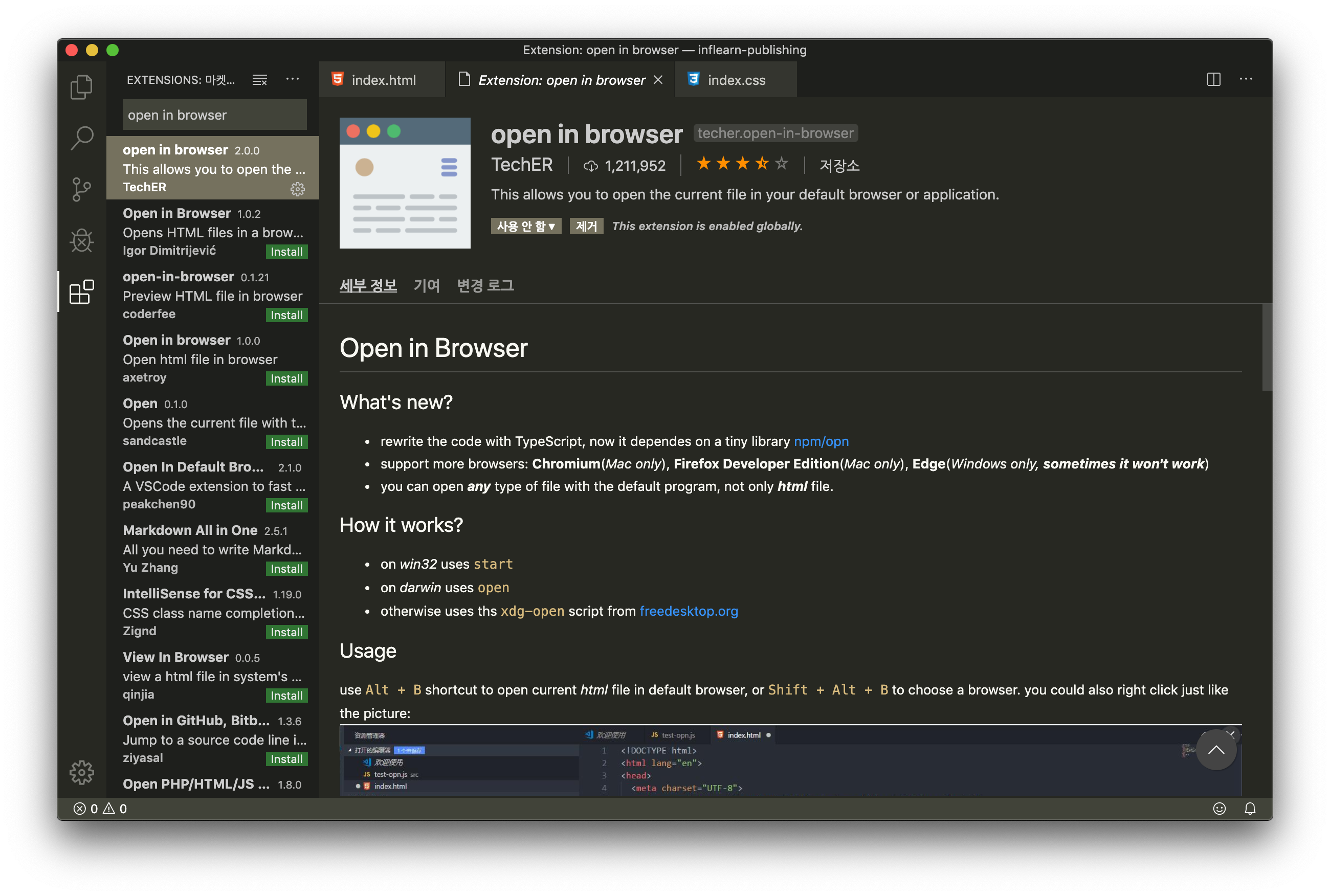 - "open in browser" 를 검색 후, 설치