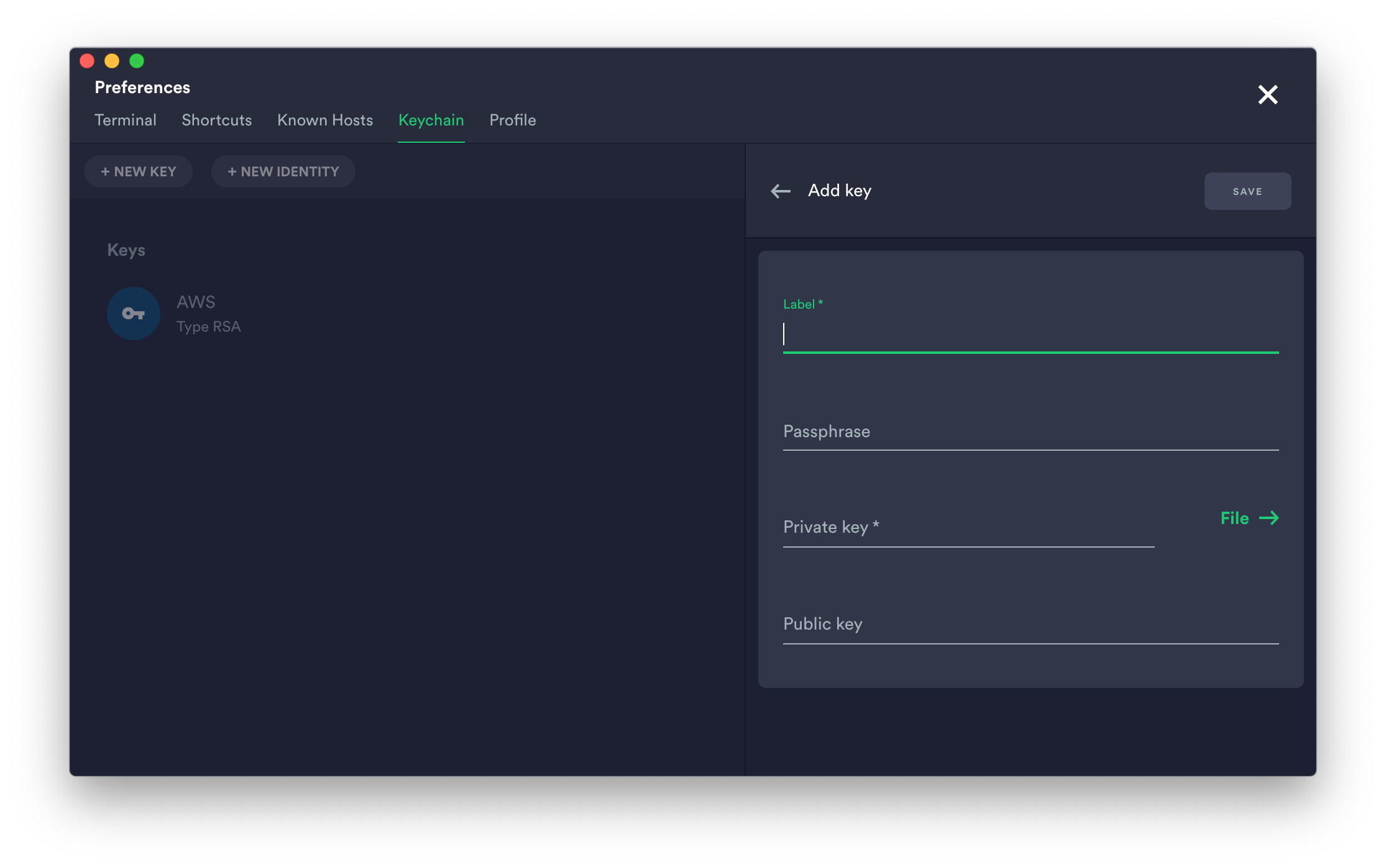 - Label, Address, Username, Password 혹은 Keys를 클릭하고 조금 전 등록한 Key 파일을 추가합니다.