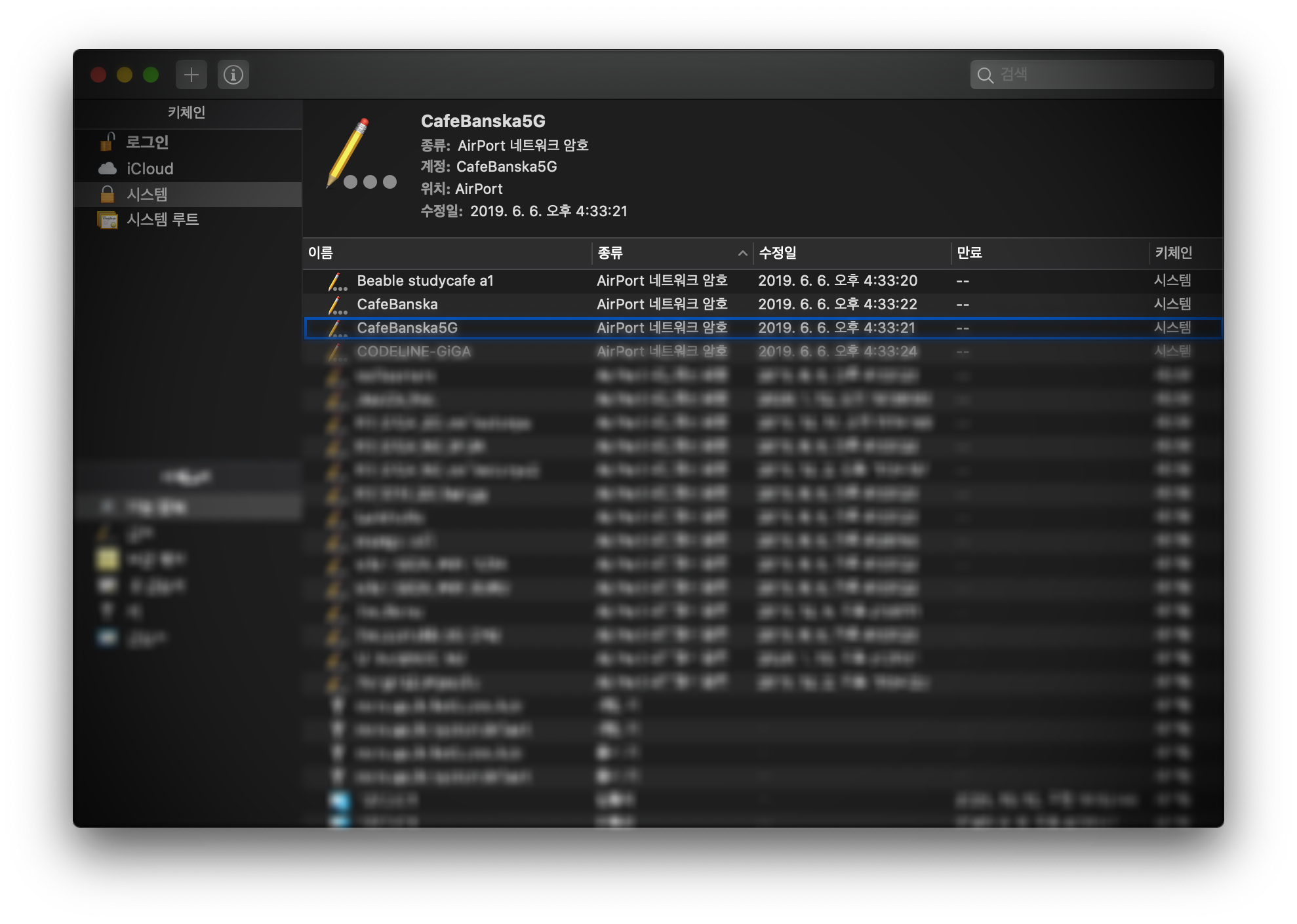 - 종류 컬럼을 클릭하여 AirPort 네트워크 암호를 우선으로 정렬