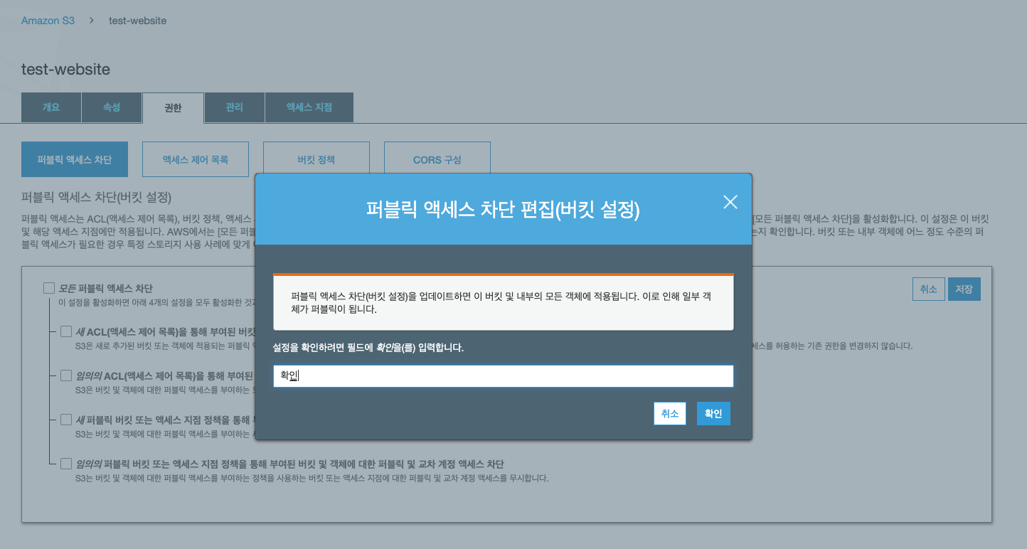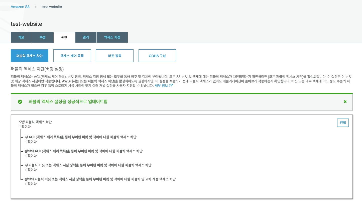 - 권한탭 -> 퍼블릭 엑세스 차단에서 모든 퍼블릭 엑세스 차단 비활성화