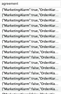 # 마케팅 알람설정값 모두 조회 SELECT JSON_EXTRACT(agreement, '$.MarketingAlarm') as MarketingAlarm FROM user # 마케팅 알람설정이 true인 데이터만 조회 SELECT JSON_EXTRACT(agreement, '$.MarketingAlarm') as MarketingAlarm FROM user WHERE JSON_EXTRACT(agreement, '$.MarketingAlarm') = true