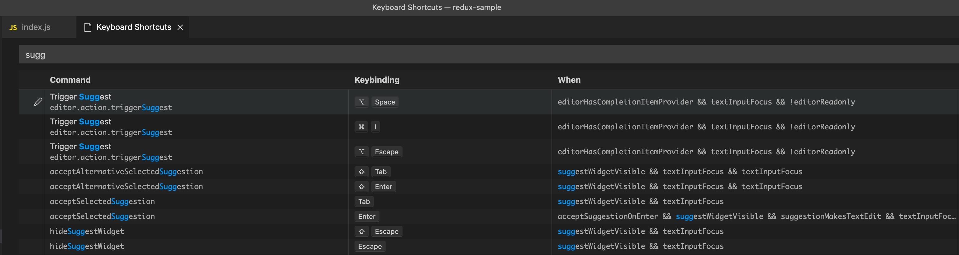 Trigger Suggest의 Keybinding에 원하는 단축키로 변경해줍니다. 필자는 option(alt) + space 단축키를 사용하였습니다.
