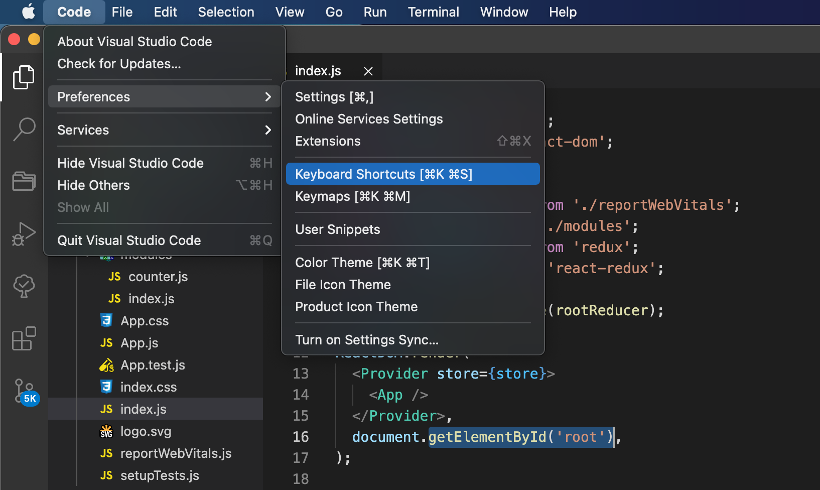 Code -> Preferences -> Keyboard Shortcuts (단축키 cmd + K, cmd + S로도 진입가능)