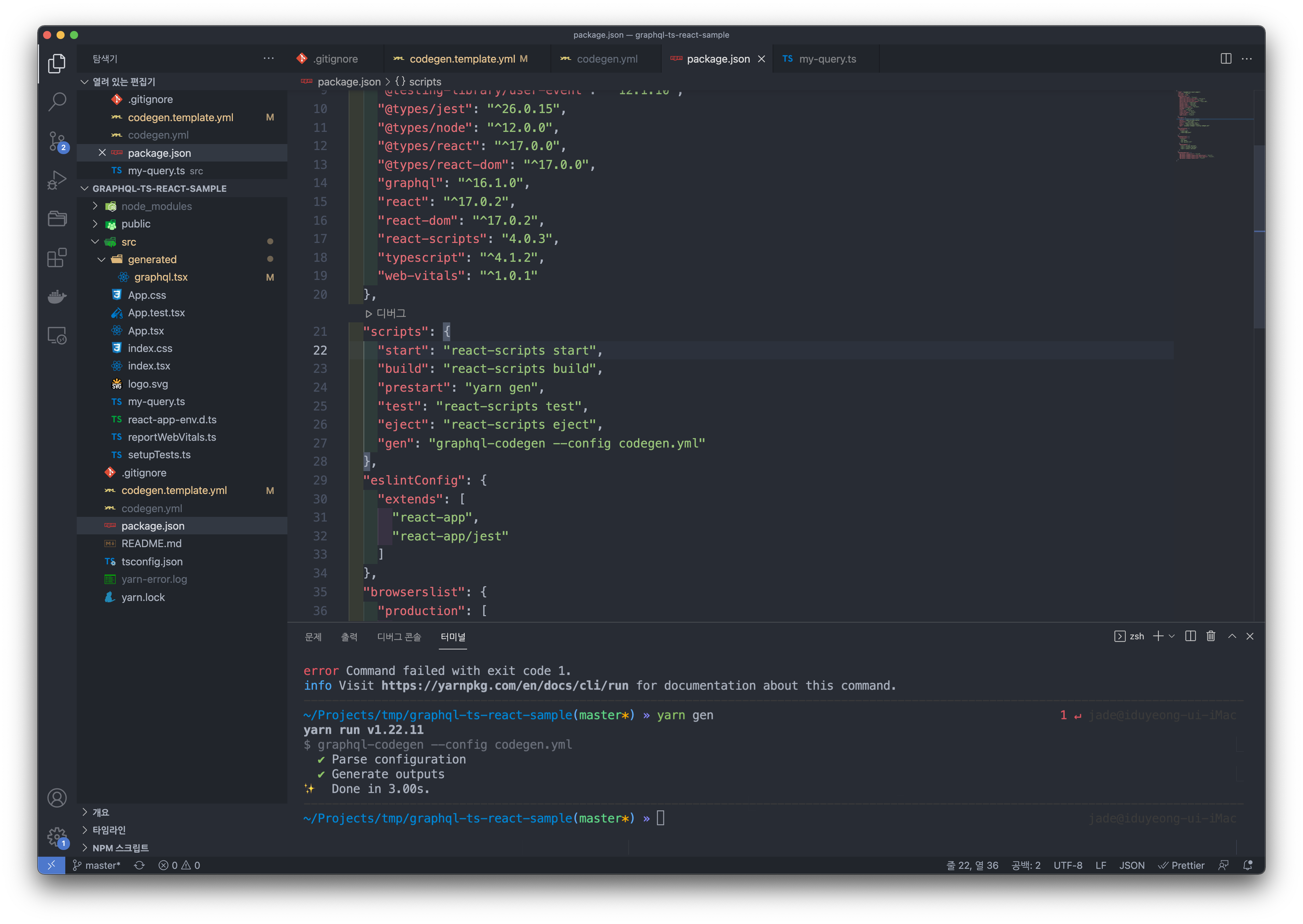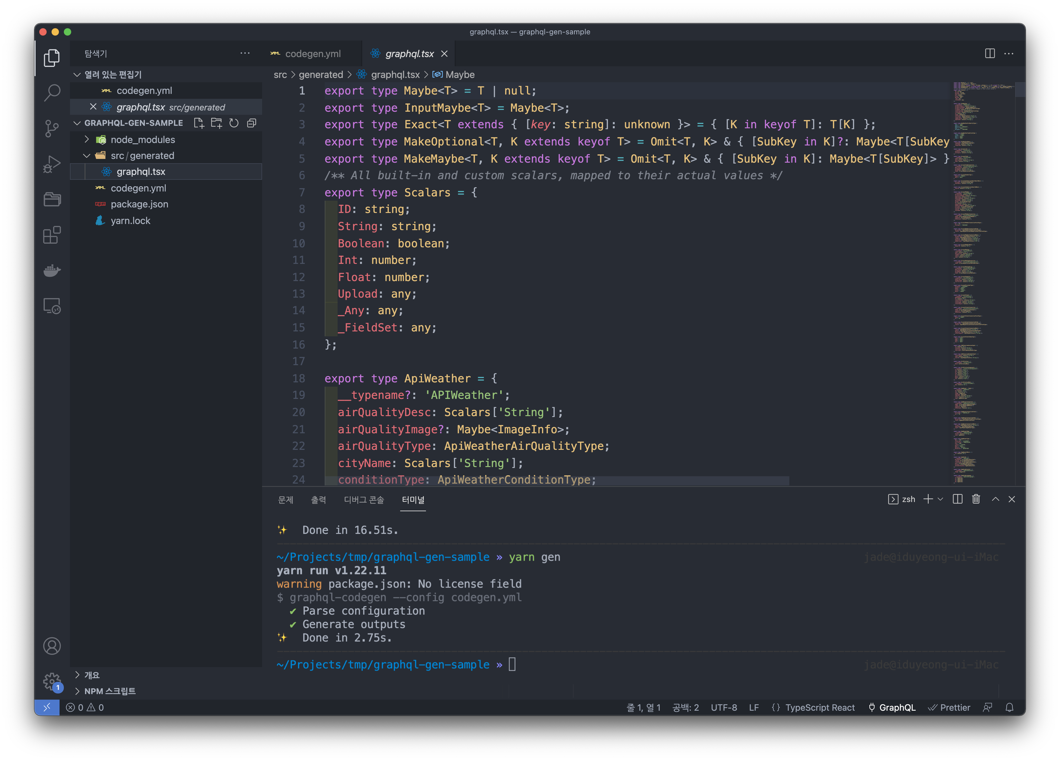 필자의 경우 CRA 프로젝트를 사용하기 때문에 스크립트 실행전에 schema generate를 자동으로 하도록 설정하도록 구성하였다. 클라이언트 어플리케이션 단에 따라서 별도의 타입을 정의하지 않아도 되기 때문에 생산성이 높아졌다. 원하는 query 또는 mutation, subscription만 정의한 후 사용하면 된다!