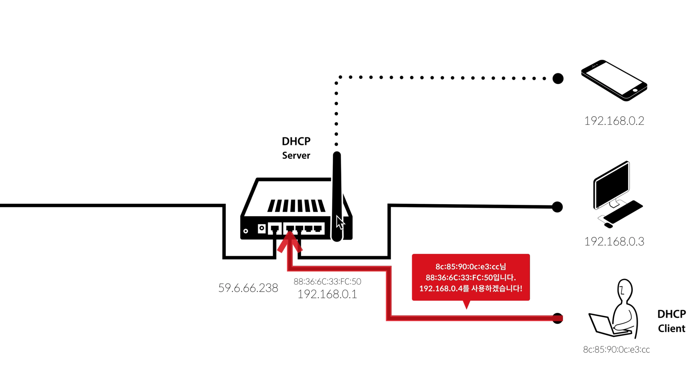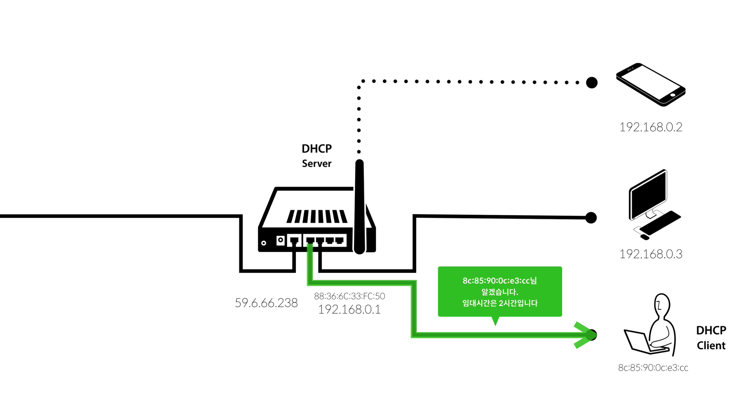 통신기기들은 MAC 주소를 가지고 있고 이를 통해서 DHCP 서버에게 사설 아이피 주소를 할당 받는다. 할당 받은 정보는 DHCP 서버가 관리하고 있기 때문에 사용가능한 사설 아이피주소를 기기에 할당해줄 수 있다.