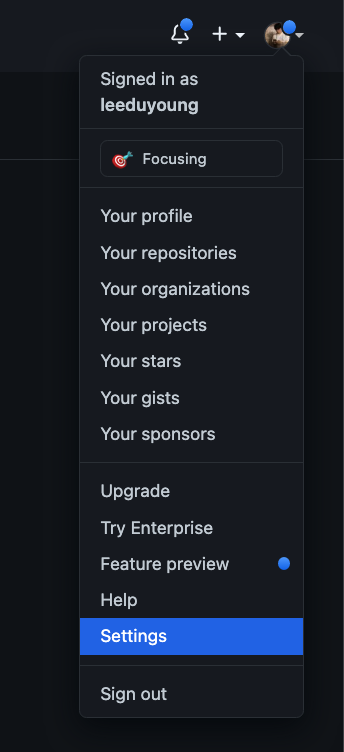 Github 우측 상단에 프로필을 선택한 후, 아래쪽에 Settings를 선택한다.