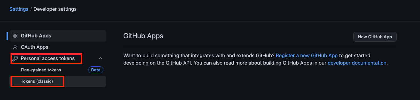 좌측 메뉴에서 Personal access tokens -> Tokens를 차례로 선택한다.
