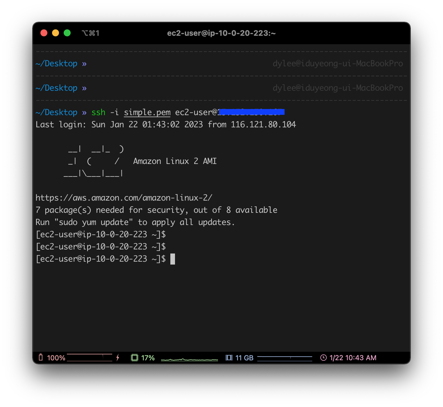 $ ssh -i [Keypair Path] [user]@[Public IP]