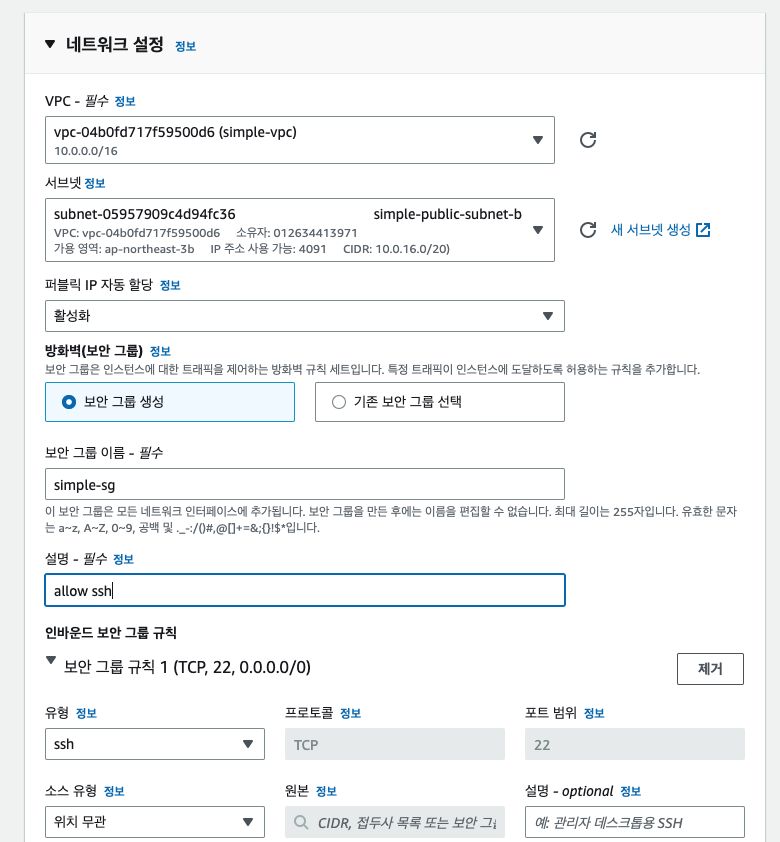 또한, Public IP를 자동할당하고 보안그룹이 없다면 생성합니다. 인바운드로 ssh 접속을 추가합니다.