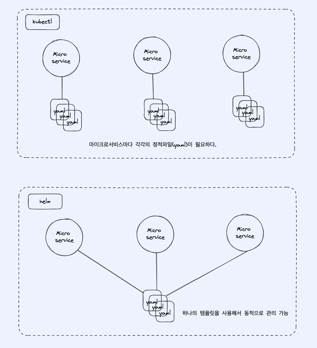 즉, 서비스가 커질수록 관리해야하는 정적 yaml 파일은 많아지게 되는데 helm을 이용하면 공통으로 사용되는 template을 정의해두고 값만 변경하여 동적으로 애플리케이션이 생성할 수 있다.