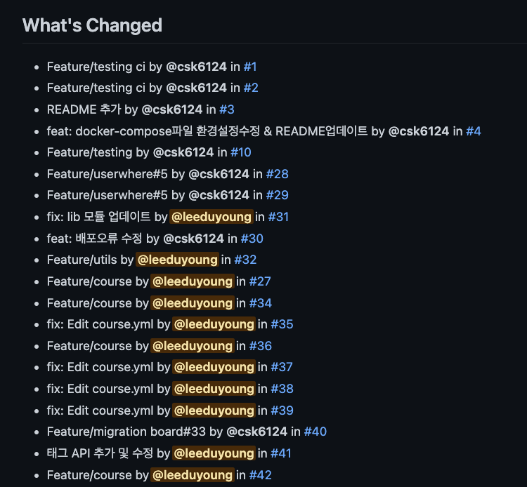 아, 그리고 하나 더 말하자면 release 배포 후 release note를 자동 불러오기 했을때 특정 기능을 개발하는동안 올려두었던 commit message들도 죄다 올라와서 어떤 기능이 추가됐고 변경되었는지 알아보기 어려웠다.