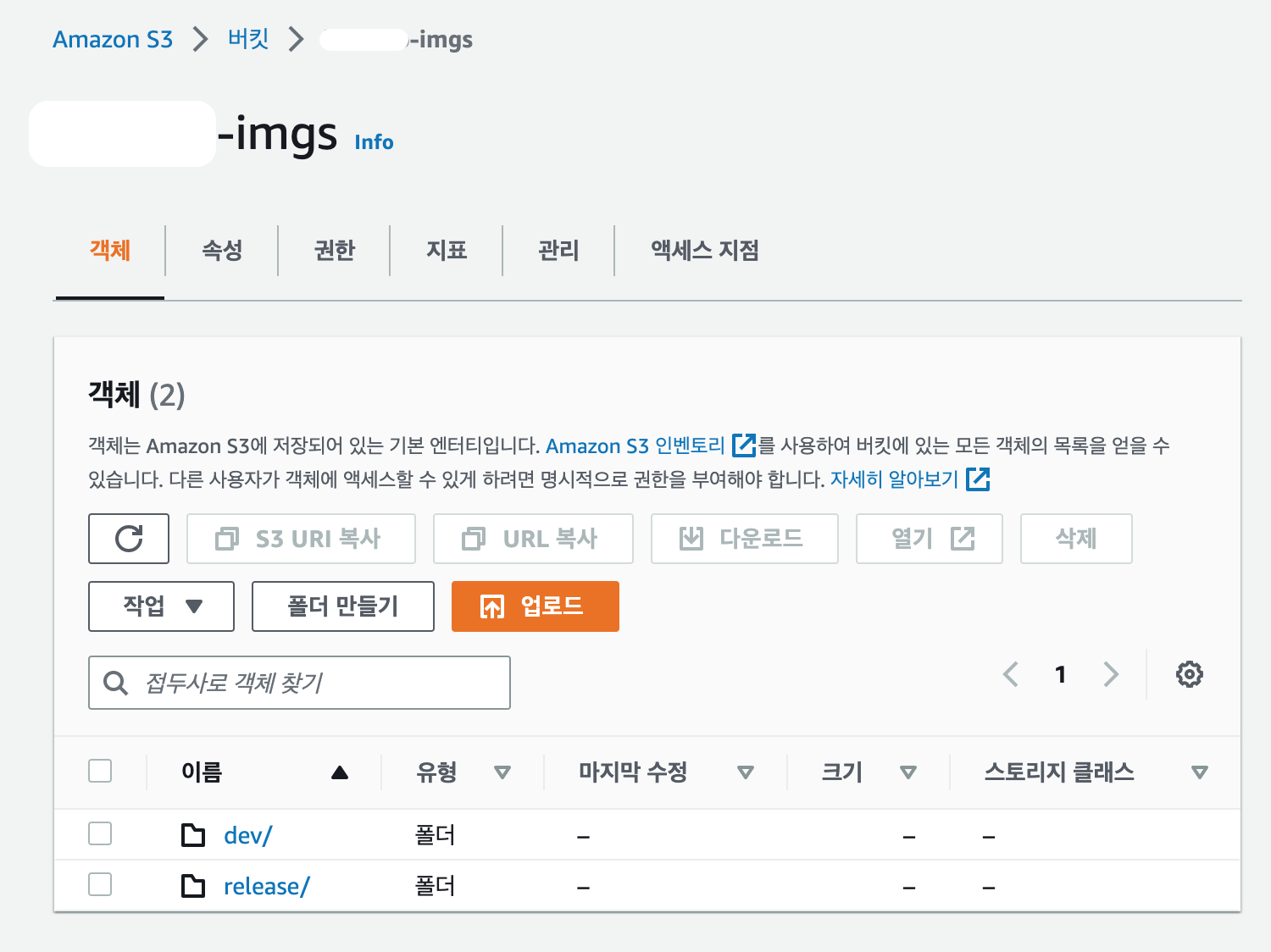 S3 버킷을 생성하고 dev, release 폴더를 만들어줍니다.