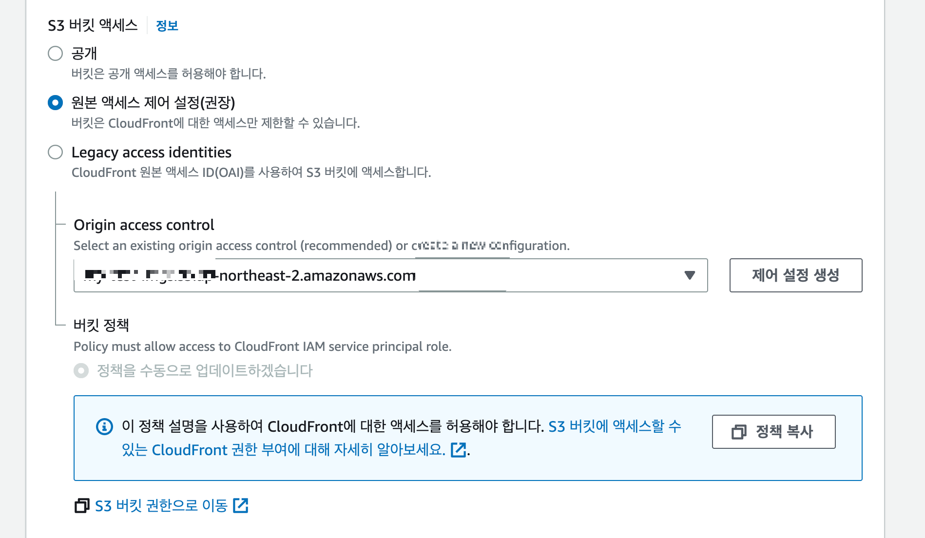 이제 S3버킷과 연동할 CloudFront를 생성합니다. 원본 엑세스 제어 설정(권장)을 선택한다.