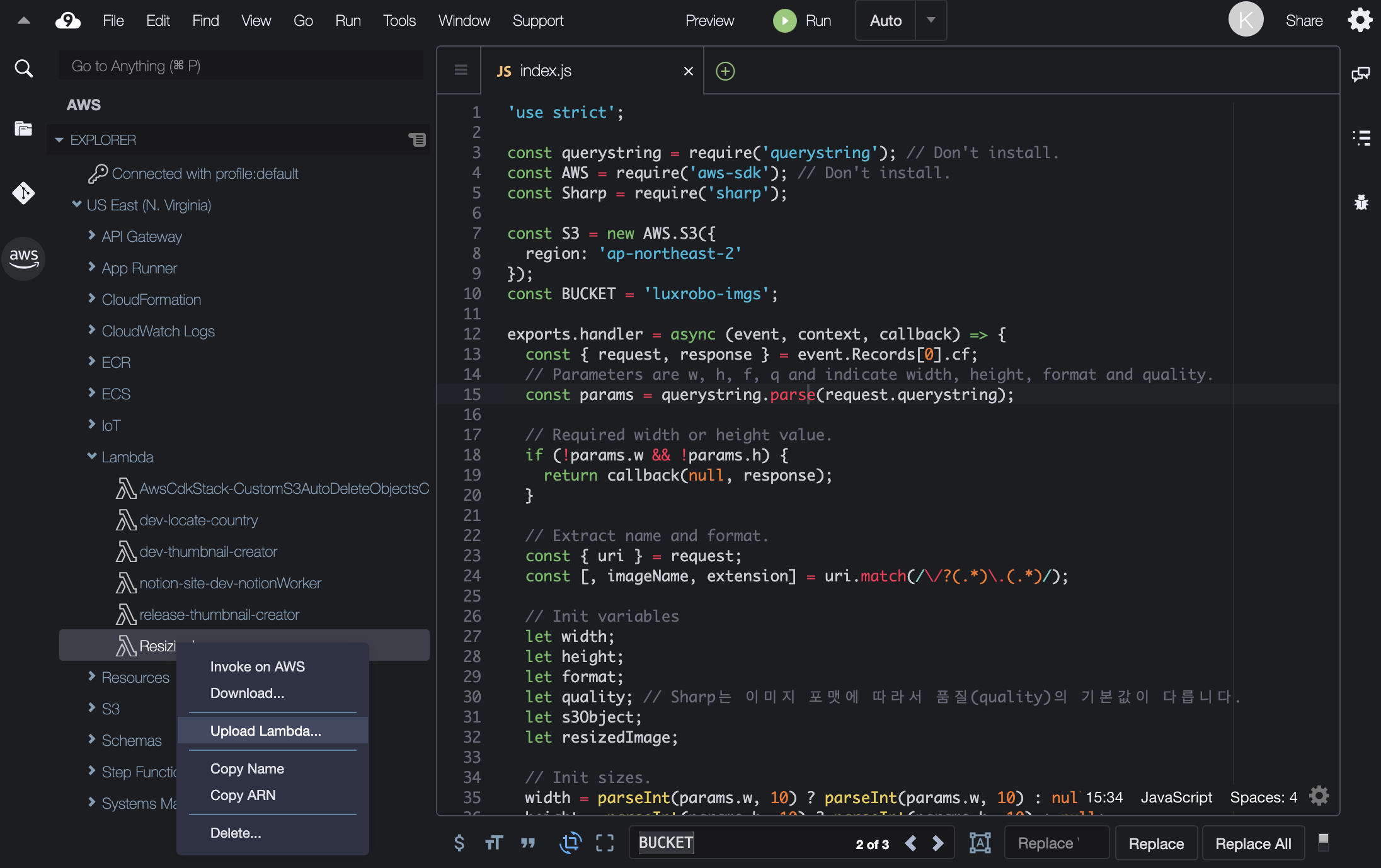 그리고, 미리 작성한 이미지 리사이징 코드인 아래 코드를 입력합니다. (S3버킷의 리전정보와 버킷명은 실제 값을 넣어야합니다.)