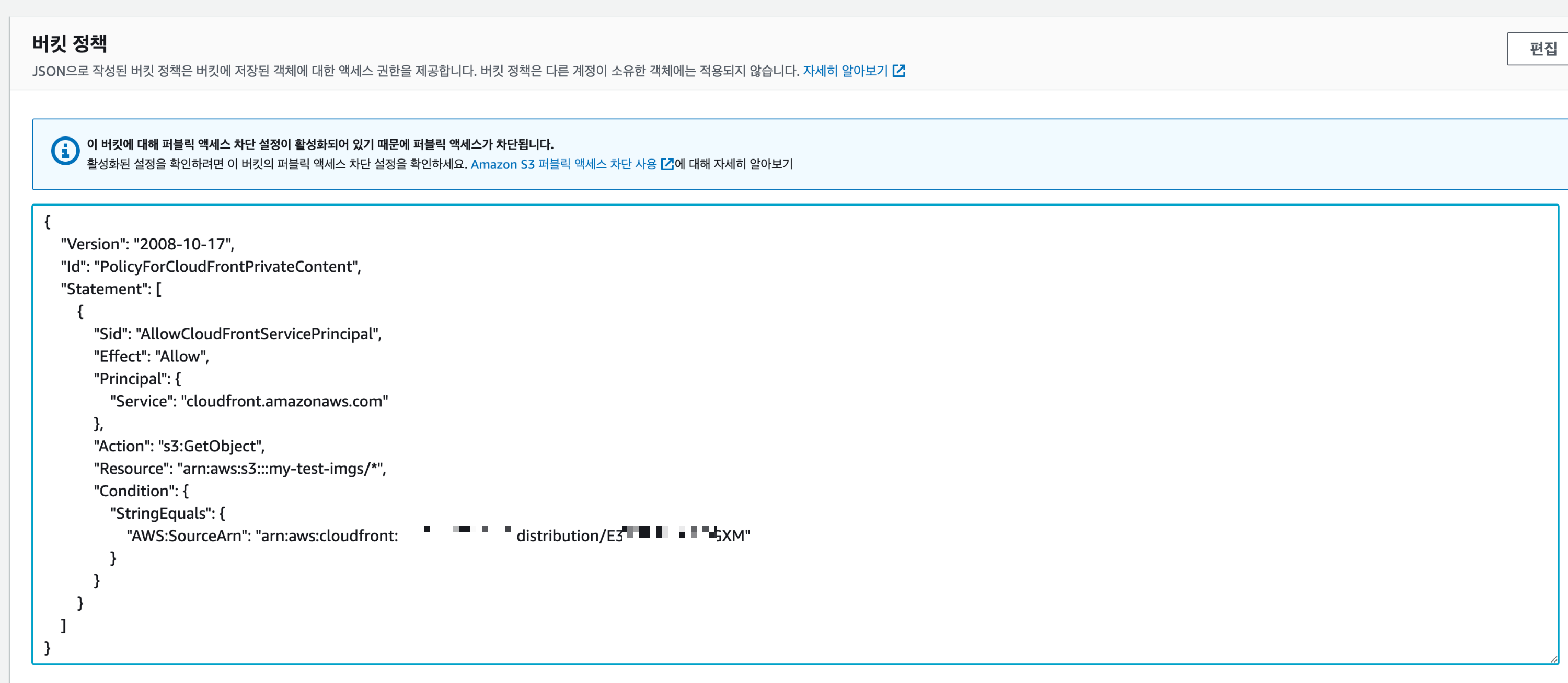 CloudFront가 생성되면 원본 탭에서 편집을 선택한다. 연결된 S3 버킷에 엑세스하기위한 정책을 등록하기위해 정책 복사를 누르고 S3 버킷 권한으로 이동한 후 버킷 정책을 수정한다.