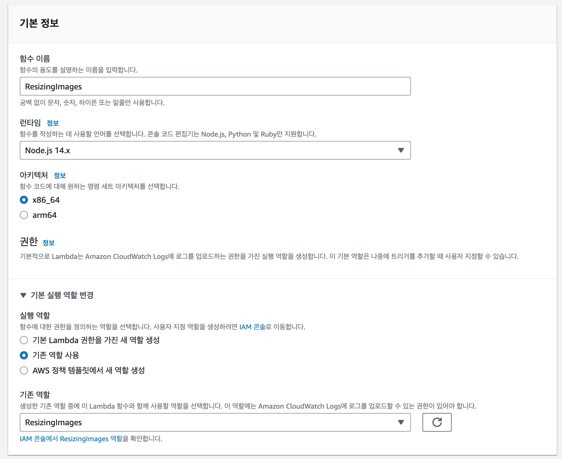 함수의 런타임으로는 Node.js 14.x를 사용하고, IAM에서 이전에 만들어둔 역할을 설정합니다.
