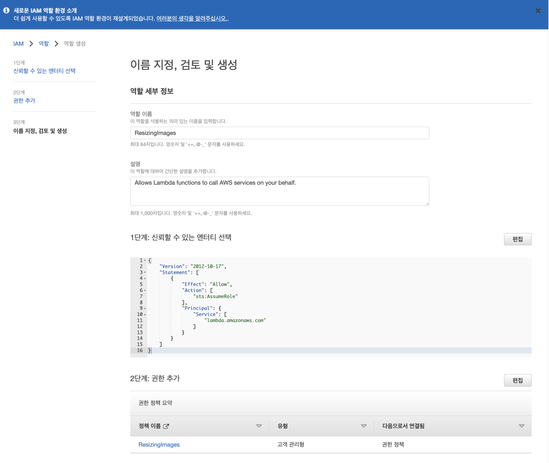 마지막 단계에서는 사용할 역할 이름을 적고 역할을 생성합니다. 해당 역할은 람다 함수에서 연결하여 사용합니다.